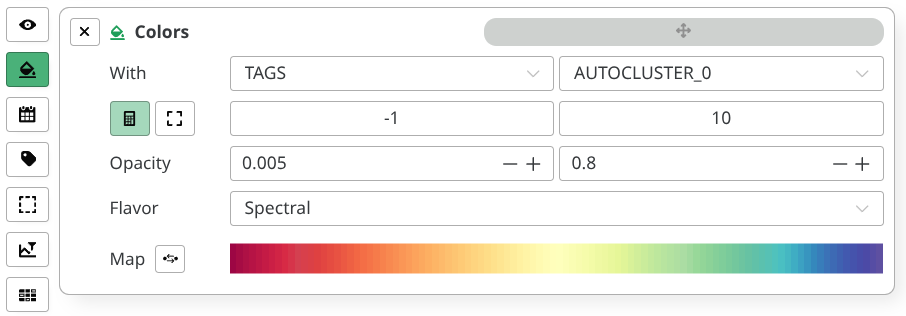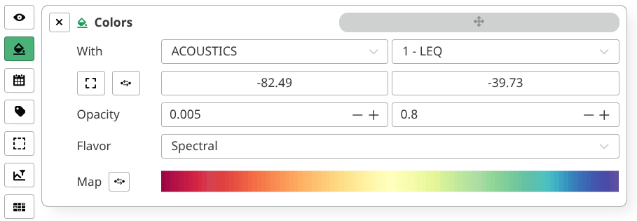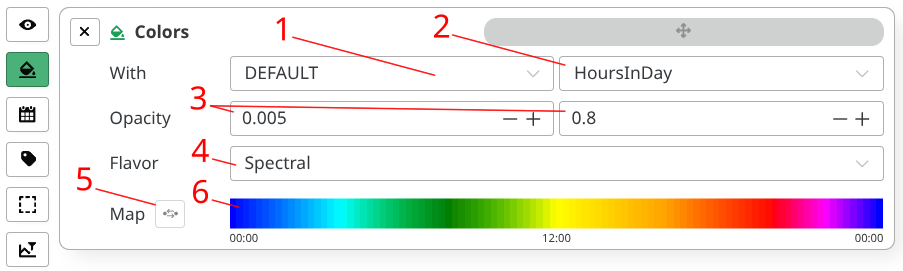 DEFAULT: color by the hour in a day, by day or night, or by interval indexTAGS: use tag values for coloringACOUSTICS: use acoustic values for coloring