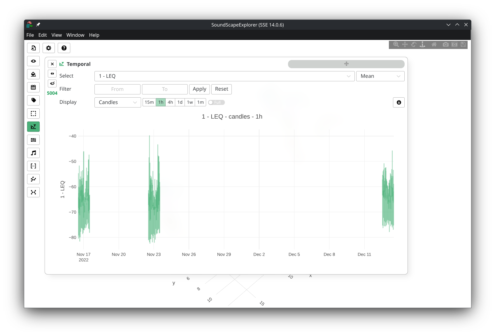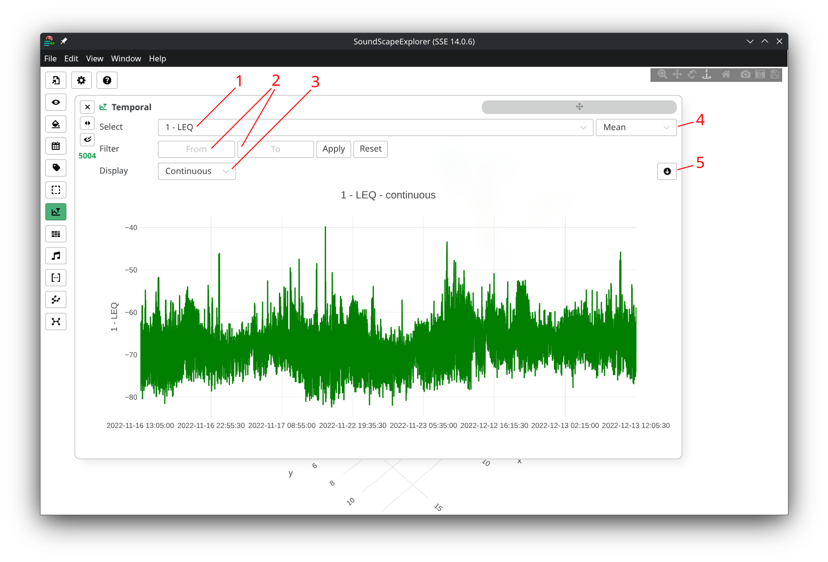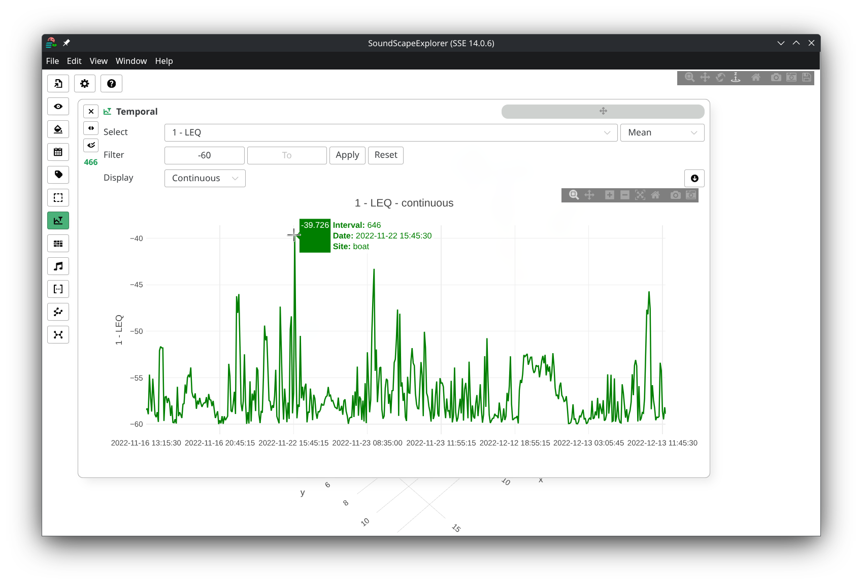 - Continuous plotting: Shows individual data points for each interval. Click any point to open the Audio player for that specific interval. Best for detailed analysis of individual measurements.